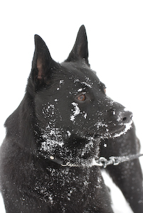 Överst till höger finner ni den mer eller mindre kolsvarta australiensiska vallhunden Yatzi, en Kelpin. Denna vinterdag har jag tur att han i lagom tid inför fotograferingen sett till att snöa ner nosen en aning. Annars hör denna svarta hund till ett av mina absolut största utmaningar fotograferingsmässigt. Att hitta en kontrastrik bakgrund som gör honom all rätt är sannerligen inte lätt. Detta trots hans ständiga välvilja att vara till lag och göra allt rätt. En egenskap som jag noga får se till att respektera för att inte vara honom till last. Då är det ofta bättre att se till att det händer något spännande istället och fånga eventuella tillfällen som bjuds. Allt för att undvika alltför tidsmässigt utdragna fotosessioner.
