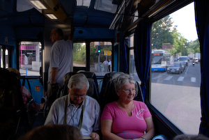 Mor och far under en färd med smalspårig järnväg upp mot bergen från den franska medelhavsstaden Nice. Det mest fascinerande med bilden är att vart fönster uppvisar olika delar av stadsmiljön.