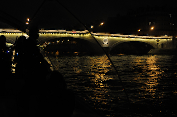 Båtturen har fortsatt genom Paris. Nu för att uppvisa ett nattligt perspektiv på tillvaron som passagerare. Ljuset från en av Paris många broar bryts vackert i vattnet och båtens böjda glasskivor.