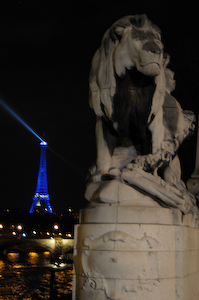 Ett fortsatt Paristema, med Eiffeltornet blåfärgat bakom en lejonstaty bredvid vattnet.