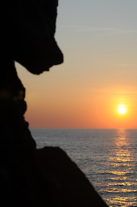 Utanför staden Ajaccio, på ön Korsika, beundras solnedgången en sensommardag. I förgrunden en stenformation påminnandes om ett hundhuvud, sedd från rätt vinkel.